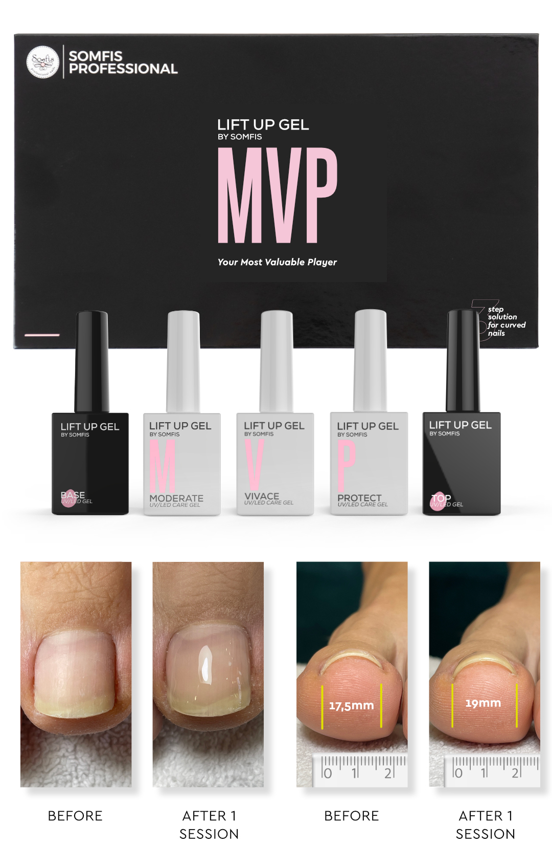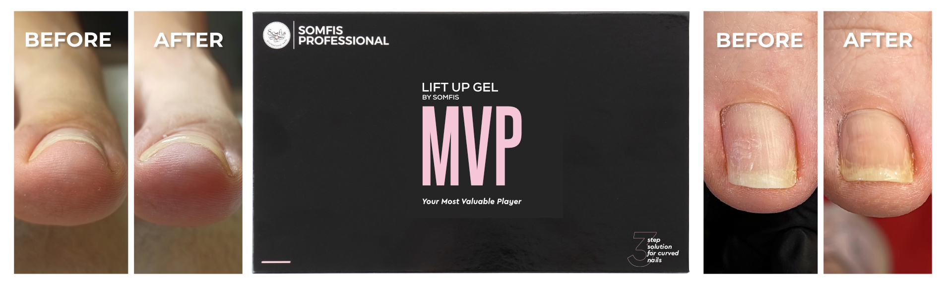 LIFT UP Gel by Somfis is a professional UV/LED nail gel system that brings innovation to the nail and foot care industry. Its advanced formula helps nail professionals refine and balance the look of curved toenails in a safe, quick and effective way — without the need for additional tools.